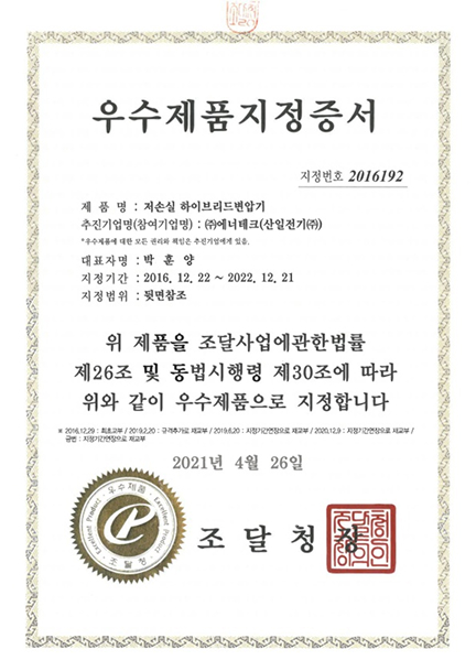 공인기관 성능시험을 통해 고조파 · 전력손실 · 권선온도 감소 효과가 입증되었습니다.