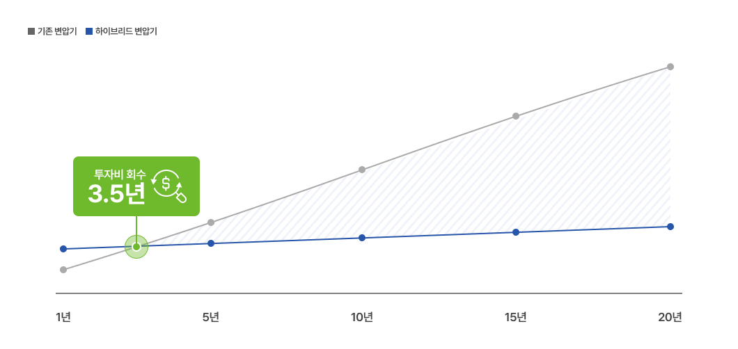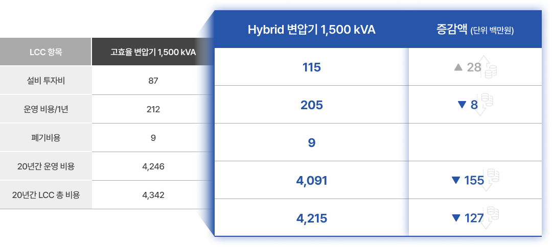 기존 변압기 대비 운영비용과 LCC 비용을 절감하고, 경쟁사 대비 설비 투자비를 최대 40% 절감하여 경제성이 우수합니다.